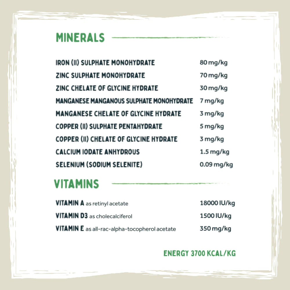 Dried ground lamb (24%), rice, sweet potato, peas, rapeseed oil, lamb hydrolysate (4%) beet fibre, kale, seaweed, chicory, minerals, inulin, DL-methionine (940 mg/kg), mannan-oligosaccharides (500 mg/kg), postbiotic yeasts (500 mg/kg), glucosamine (400 mg/kg). chondroitin sulphate (300 mg/kg), yucca schidigera, natural antioxidants (tocopherol extracts and rosemary extract), L-tryptophan, thyme, carnitine (50 mg/kg), cranberry, dandelion root, marigold yellow, ginger, turmeric, selenium yeast.