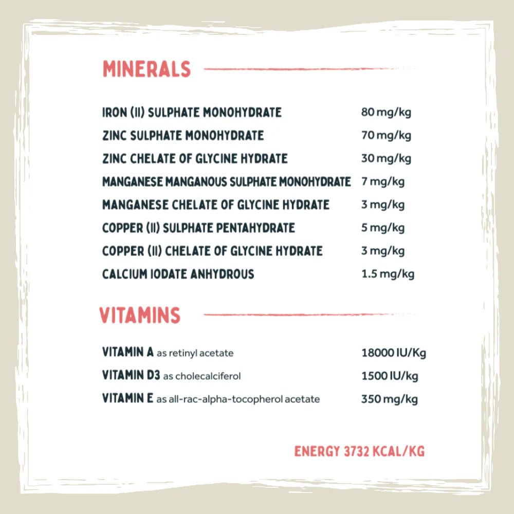 Dried ground salmon (22%), sweet potato, peas, tapioca, rapeseed oil, dry ground white fish (6%), salmon hydrolysate (3%), salmon oil (2.5%), beet fibre, spirulina, seaweed, kale, chicory, minerals, inulin, DL-methionine (500 mg/kg), mannan-oligosaccharides (500 mg/kg), postbiotic yeasts (500 mg/kg), glucosamine (400 mg/kg), chondroitin sulphate (300 mg/kg), yucca schidigera, natural antioxidants (tocopherol extracts and rosemary extract), thyme, carnitine (50 mg/kg), cranberry, dandelion root, marigold yellow, ginger, turmeric.