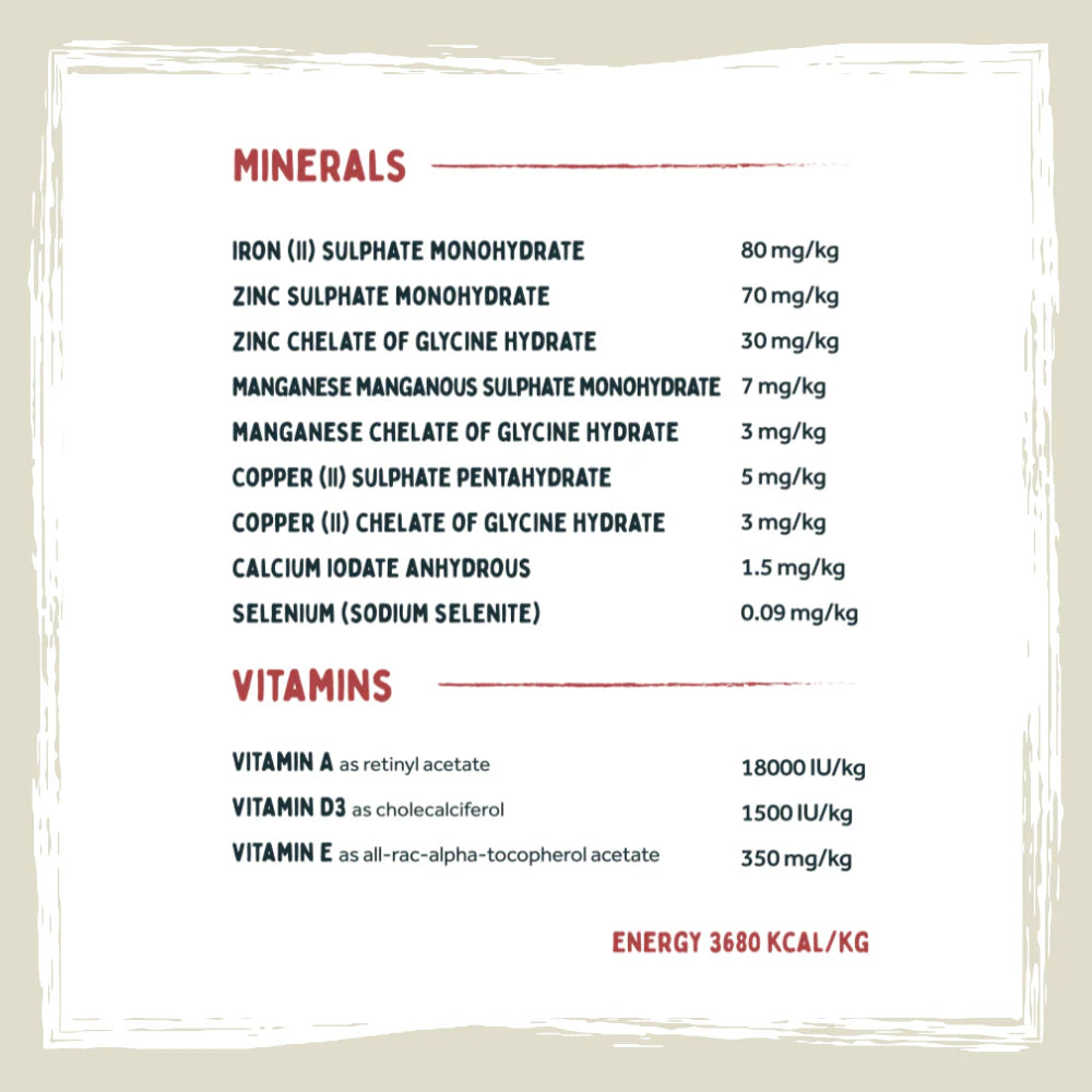 Dry ground venison (16.5%), dry ground trout (16%), peas, sweet potato, tapioca, rapeseed oil, fish oil (3%), marine hydrolysate (3%), beet pulp, kale, seaweed, green-lipped mussel, chicory, inulin, DL-methionine (650 mg/kg). mannan-oligosaccharides (500 mg/kg), postbiotic yeast (500 mg/kg), glucosamine (400 mg/kg), chondroitin sulphate (300 mg/kg), yucca schidigera, natural antioxidants (vit. E and rosemary), cranberry, L-tryptophan (150 mg/kg), carnitine (50 mg/kg). dandelion root, marigold yellow, lutein, ginger, turmeric, thyme.